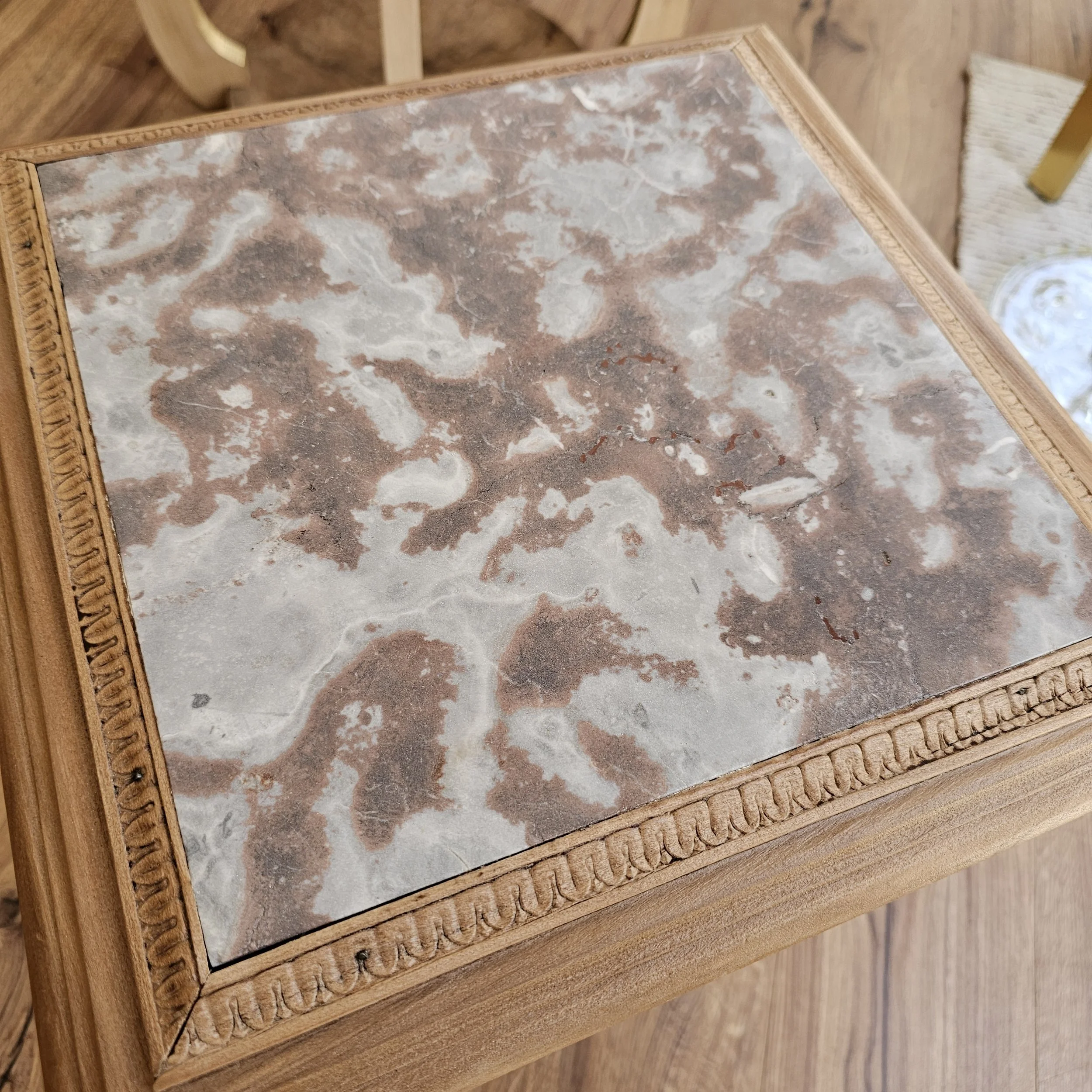 Son allure est immédiatement élégante : piètement fin, ceinture richement sculptée, détails ciselés sur les montants et plateau minéral aux nuances nuagées, entre gris doux, beige pierre et tonalités rosées.
