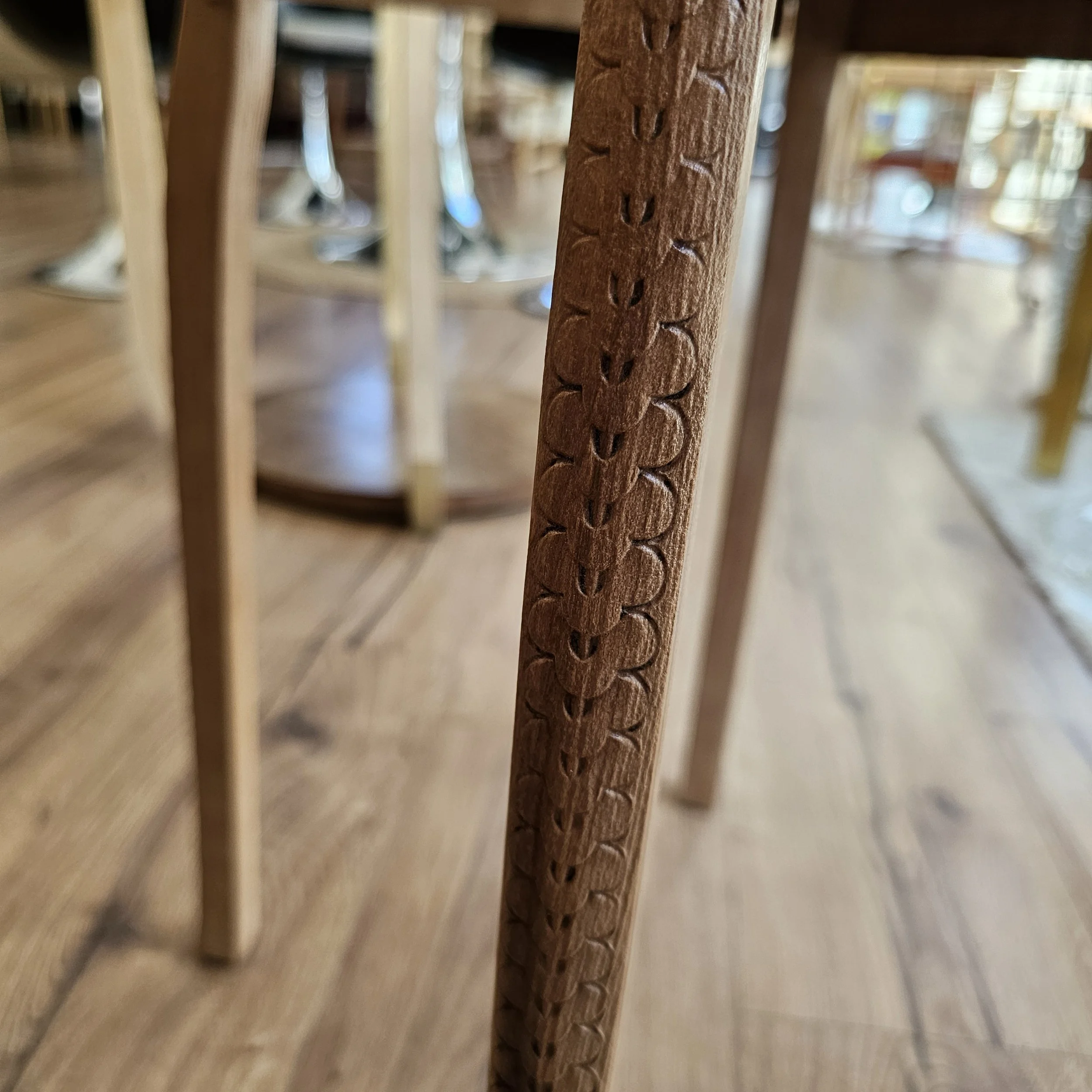 La structure, en hêtre massif, a été mise à nu et laissée volontairement claire pour créer un contraste élégant avec la richesse du plateau.