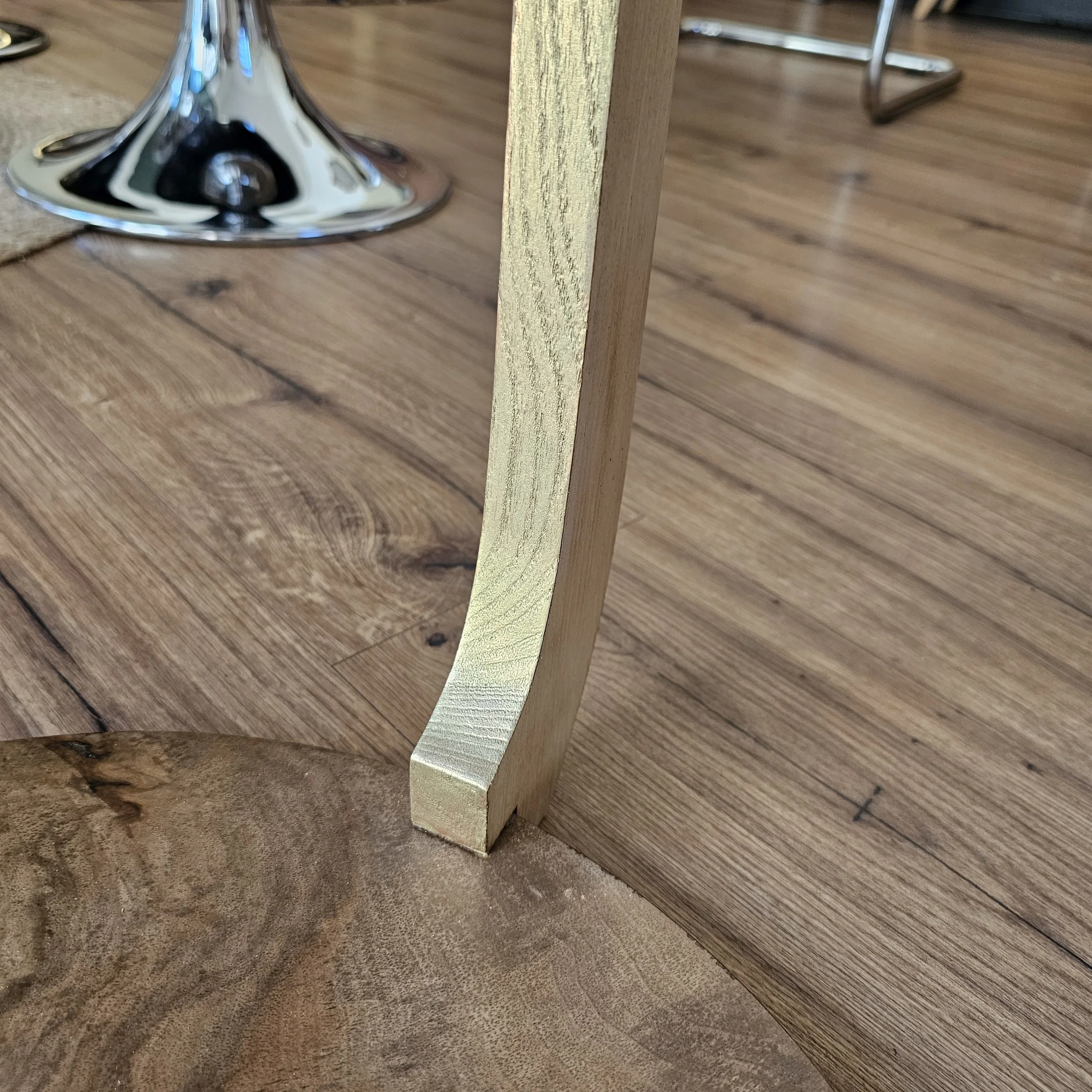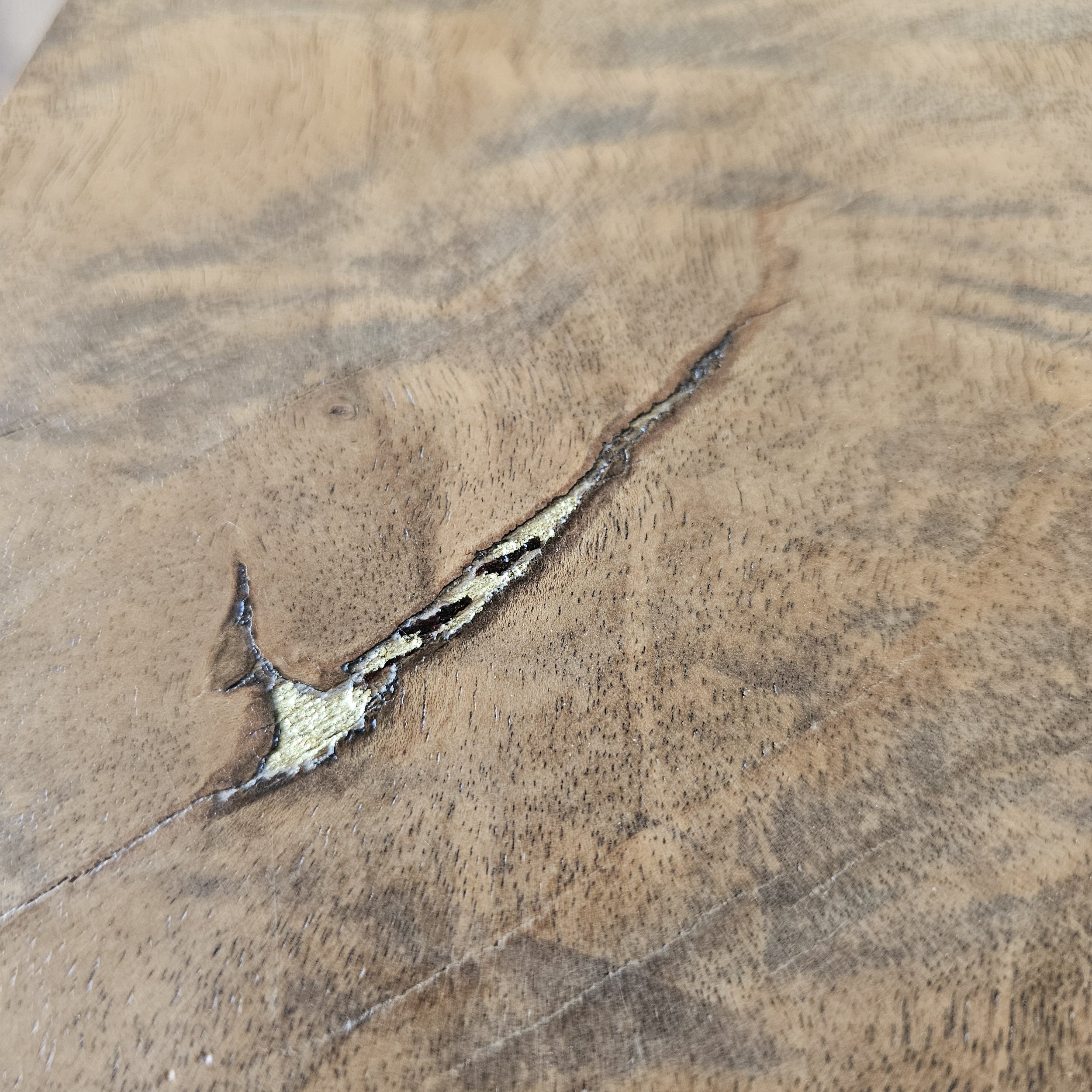 De petites pointes de bourre anciennes ont été intégrées pour souligner et assumer ces cicatrices du bois, dans un esprit décoratif et respectueux de son histoire.