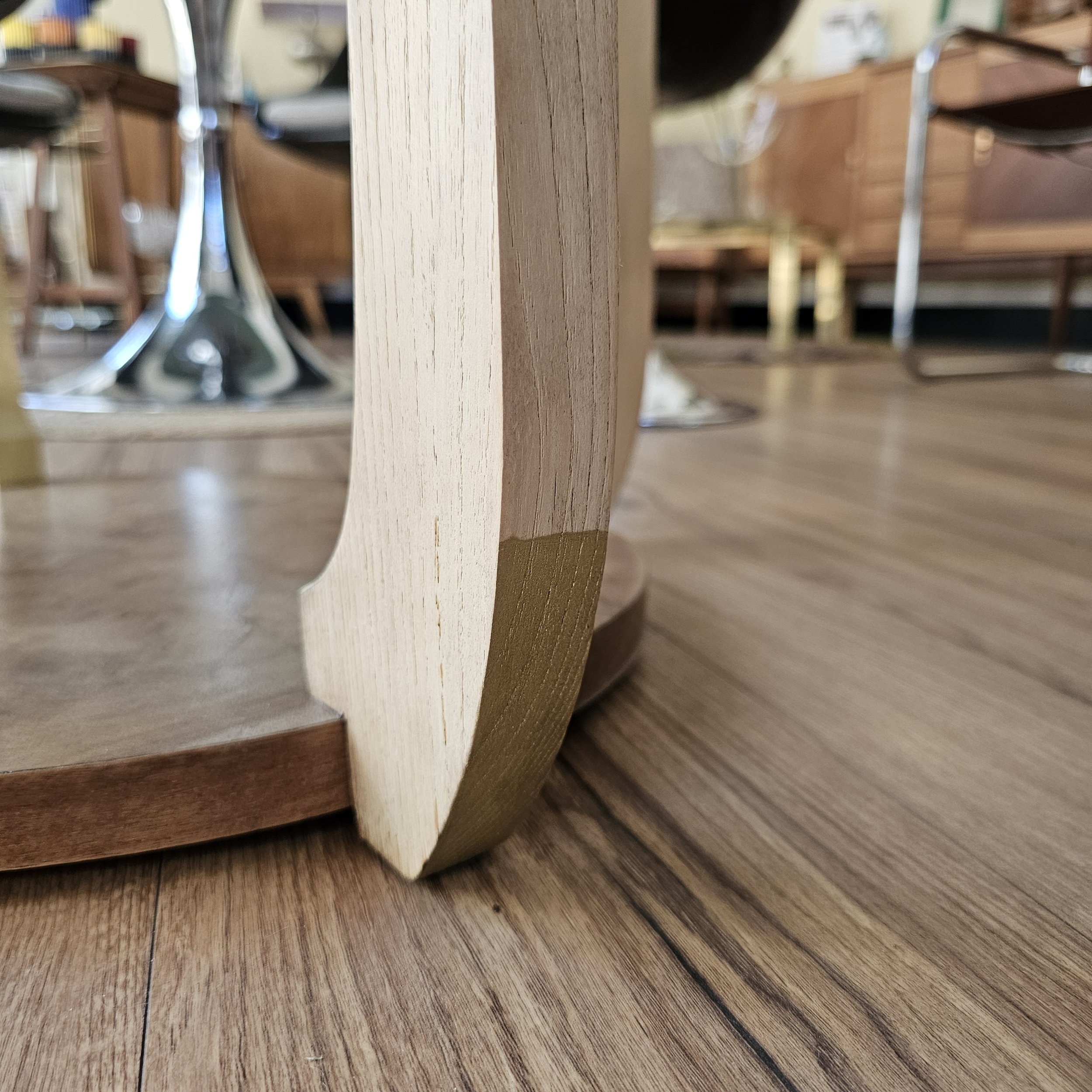 Le plateau, en placage bois très marqué, présentait de nombreuses altérations. Il a été entièrement aérogommé, puis soigneusement repris pour conserver son authenticité tout en le stabilisant.