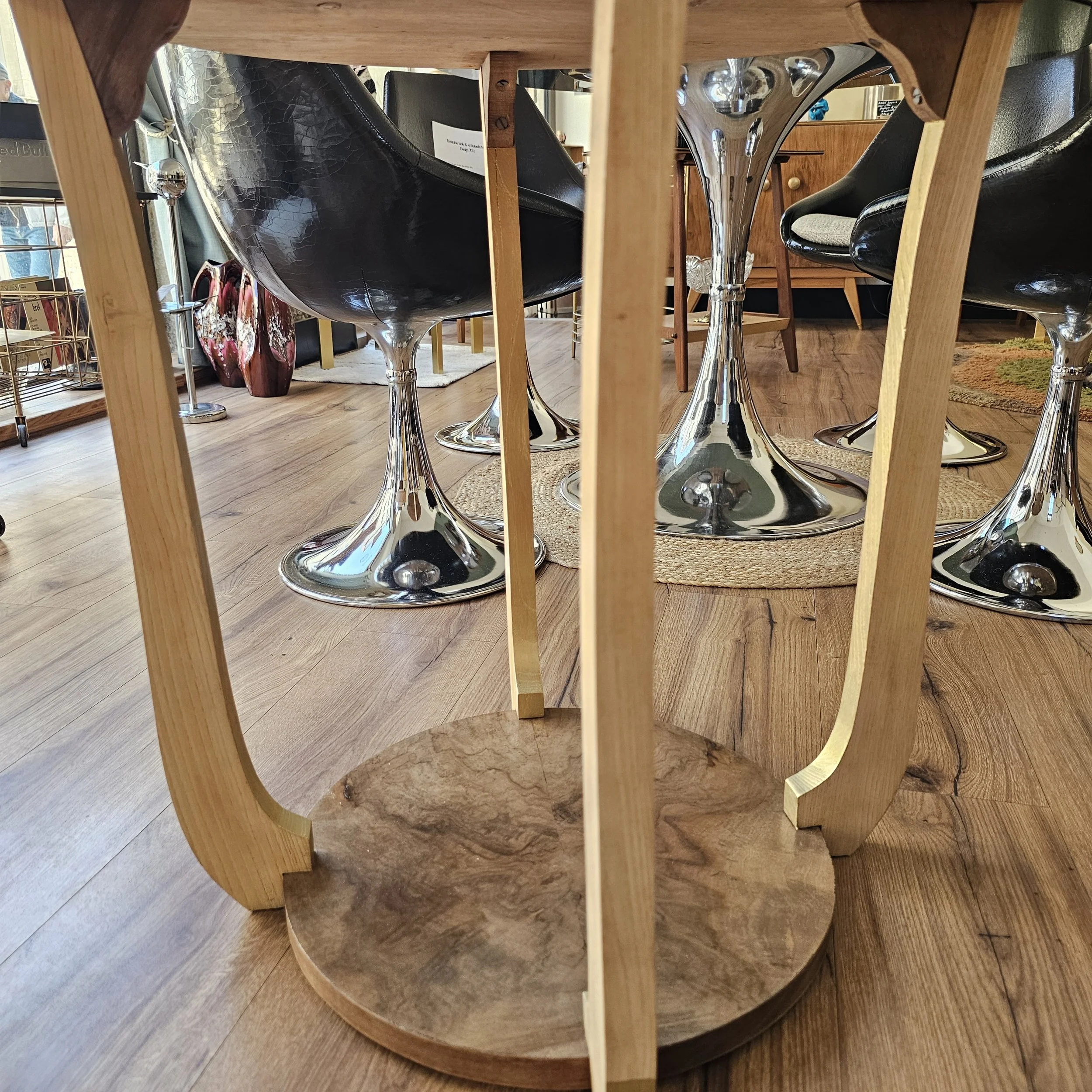 La structure, en hêtre massif, a été mise à nu et laissée volontairement claire pour créer un contraste élégant avec la richesse du plateau.