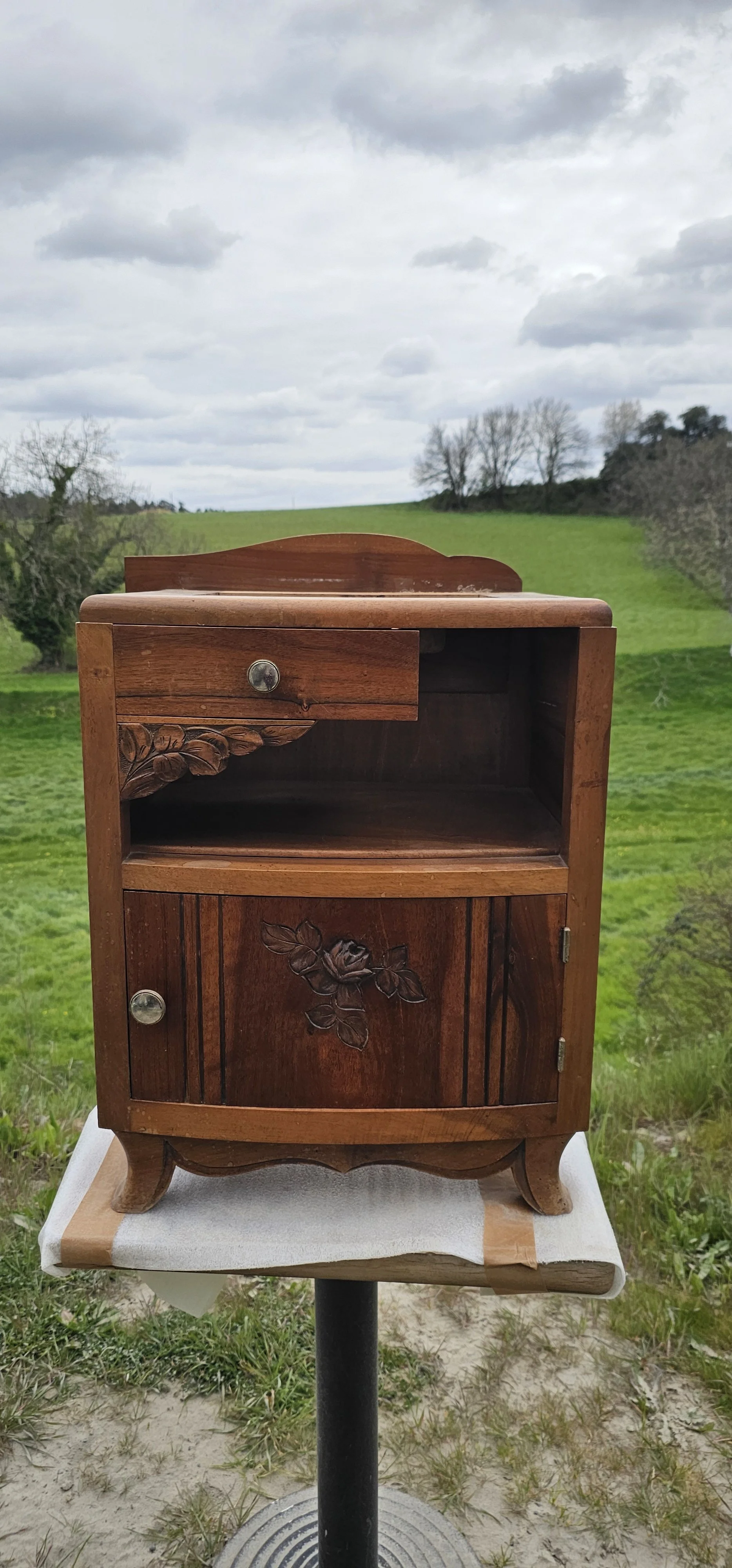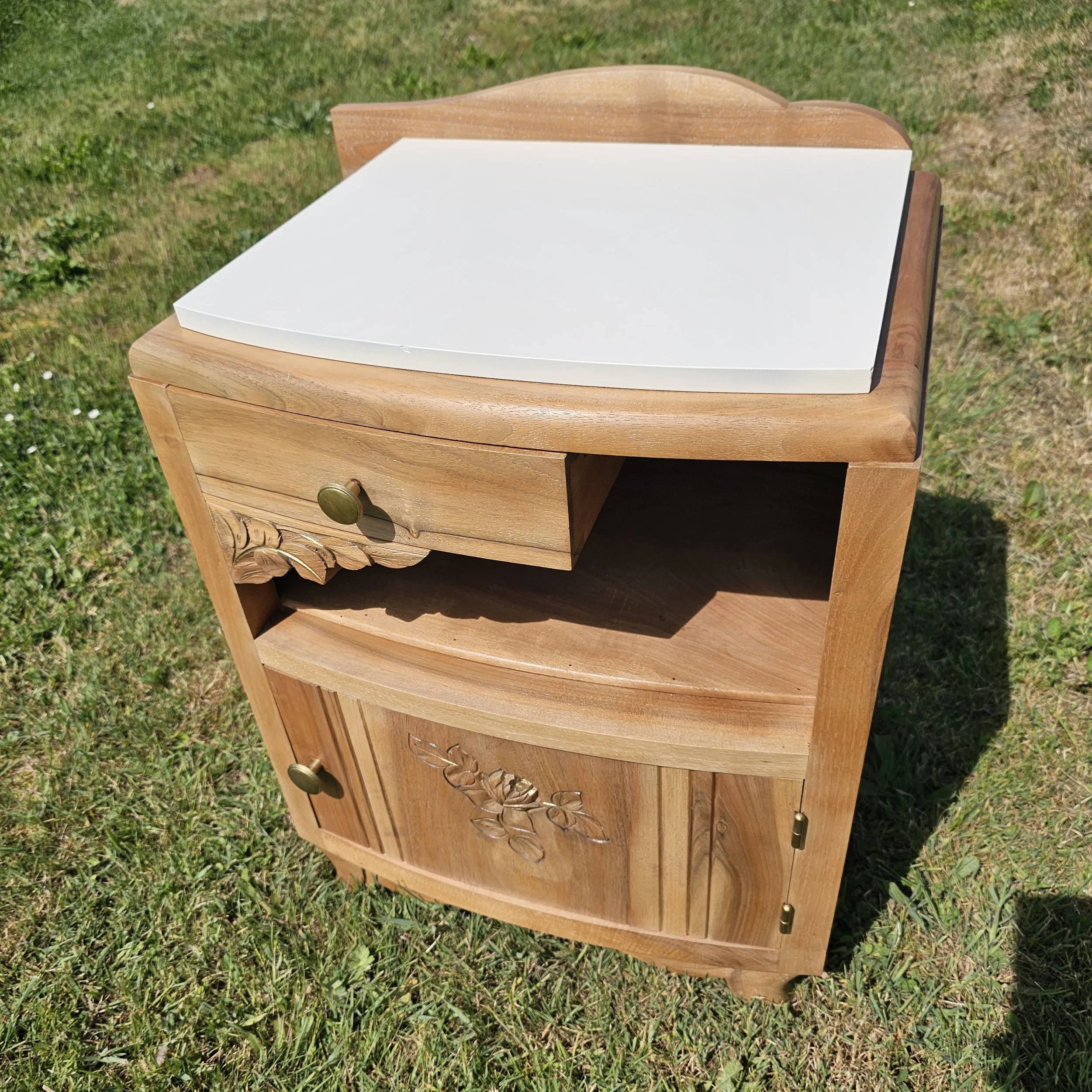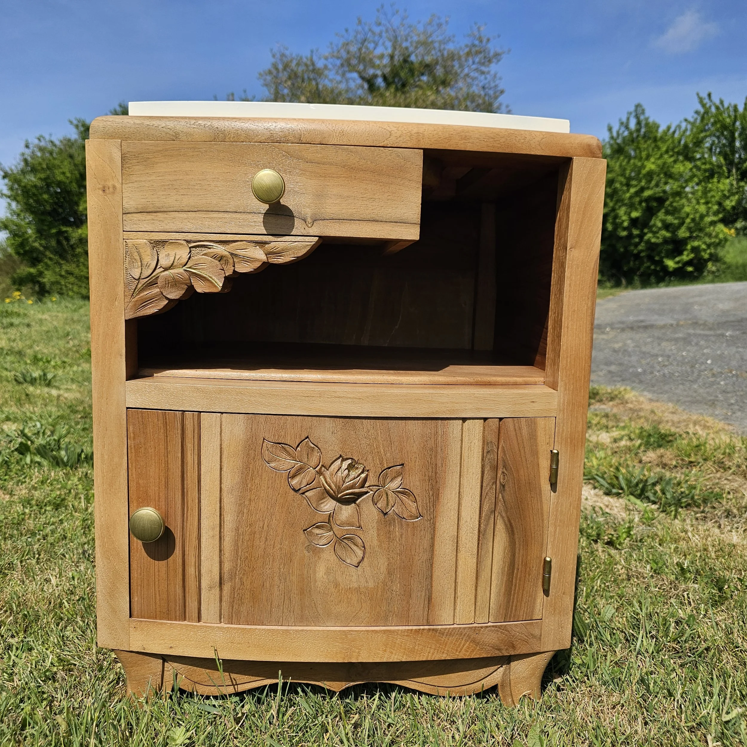 Avec ses lignes galbées, ses sculptures florales et son petit format pratique, il trouve facilement sa place en chevet, en bout de canapé ou en petit meuble d’appoint dans une chambre, une entrée ou un coin lecture.