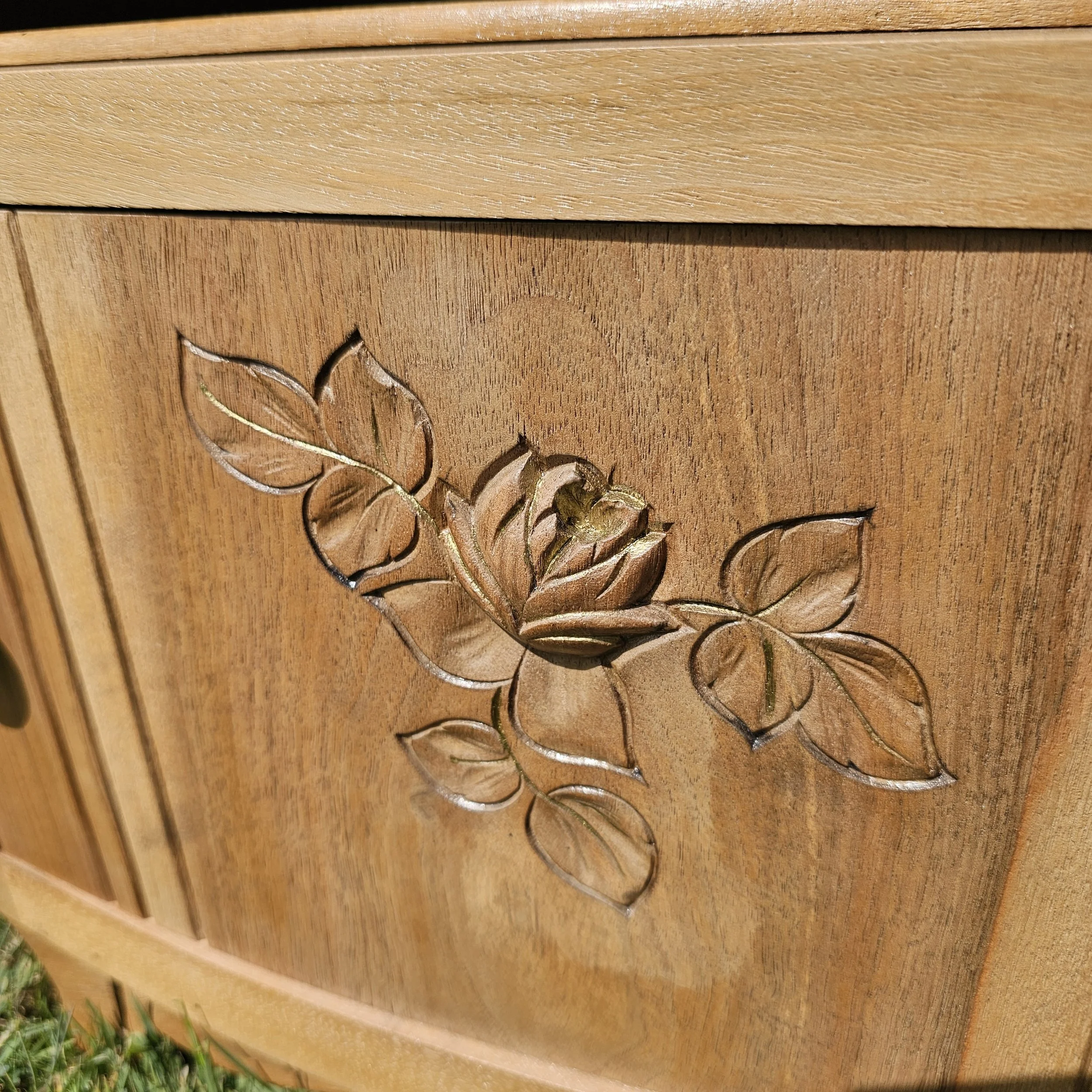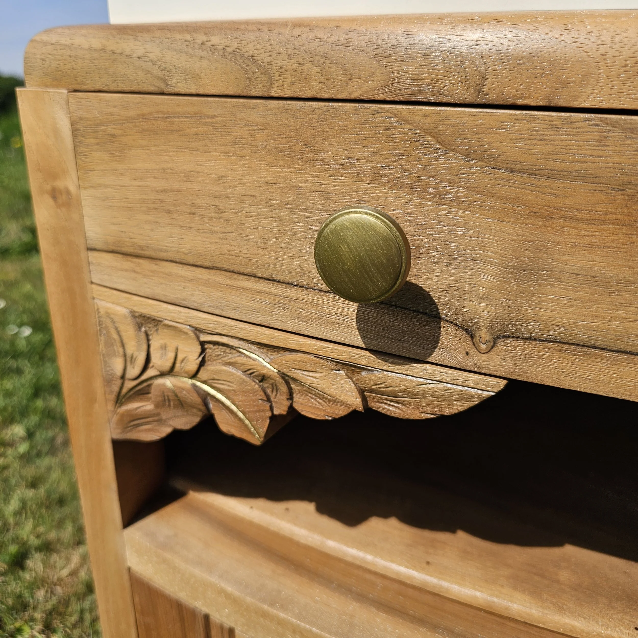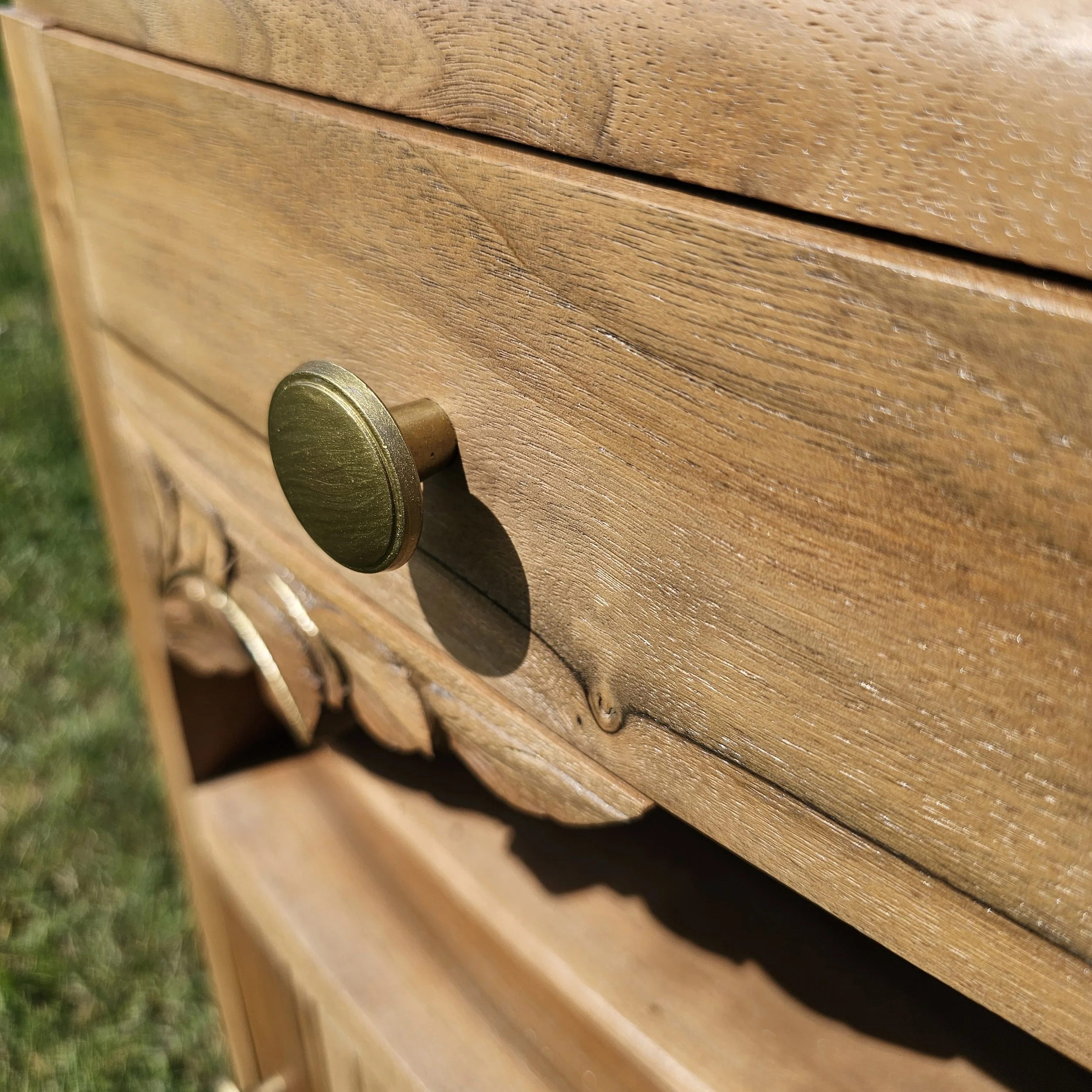 Les poignées et ferrures ont été reprises dans une teinte doré or ancien, et une très légère touche du même or a été délicatement déposée sur les sculptures afin d’en souligner le relief avec subtilité.